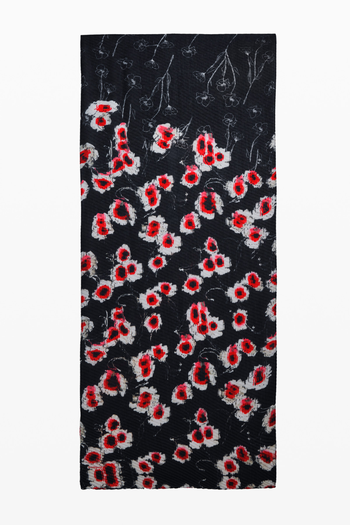 A természet ihlette ezt a téglalap alakú, különféle méretű és színű virágokkal mintázott sálat;
