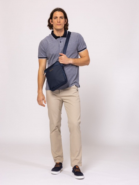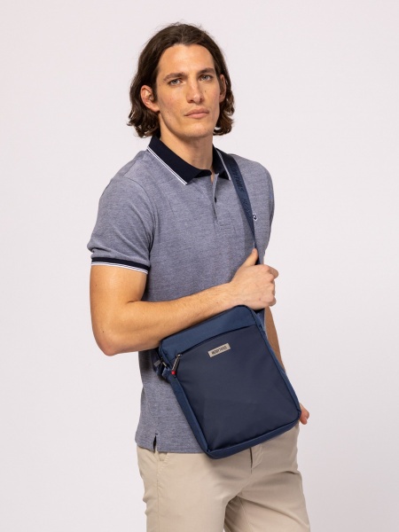 A4 méretű oldaltáska állítható vállpánttal, Főrekesze cipzárral zárható, egy zsebel a táska elején, egy zsebbel hátul, belső rendszerezővel (szivacsozott rekesszel, akár tablettartóként is funkcionál); Anyag: vászon (eső álló) poliészter; Méretek: 30 x 22 x 5 cm
