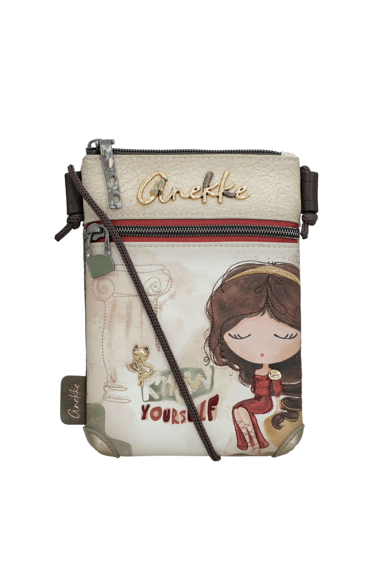 Egy Anekke táska és pénztárca kollekció, amely a klasszikus Görögországba repít, templomok, oszlopok és szobrok közé, amelyek mintha azt suttognák, hogy te is a történelem része vagy. Éteri nyomatokkal, fémes részletekkel és egy olyan esztétikával, amely tiszteleg a benned élő múzsa előtt.