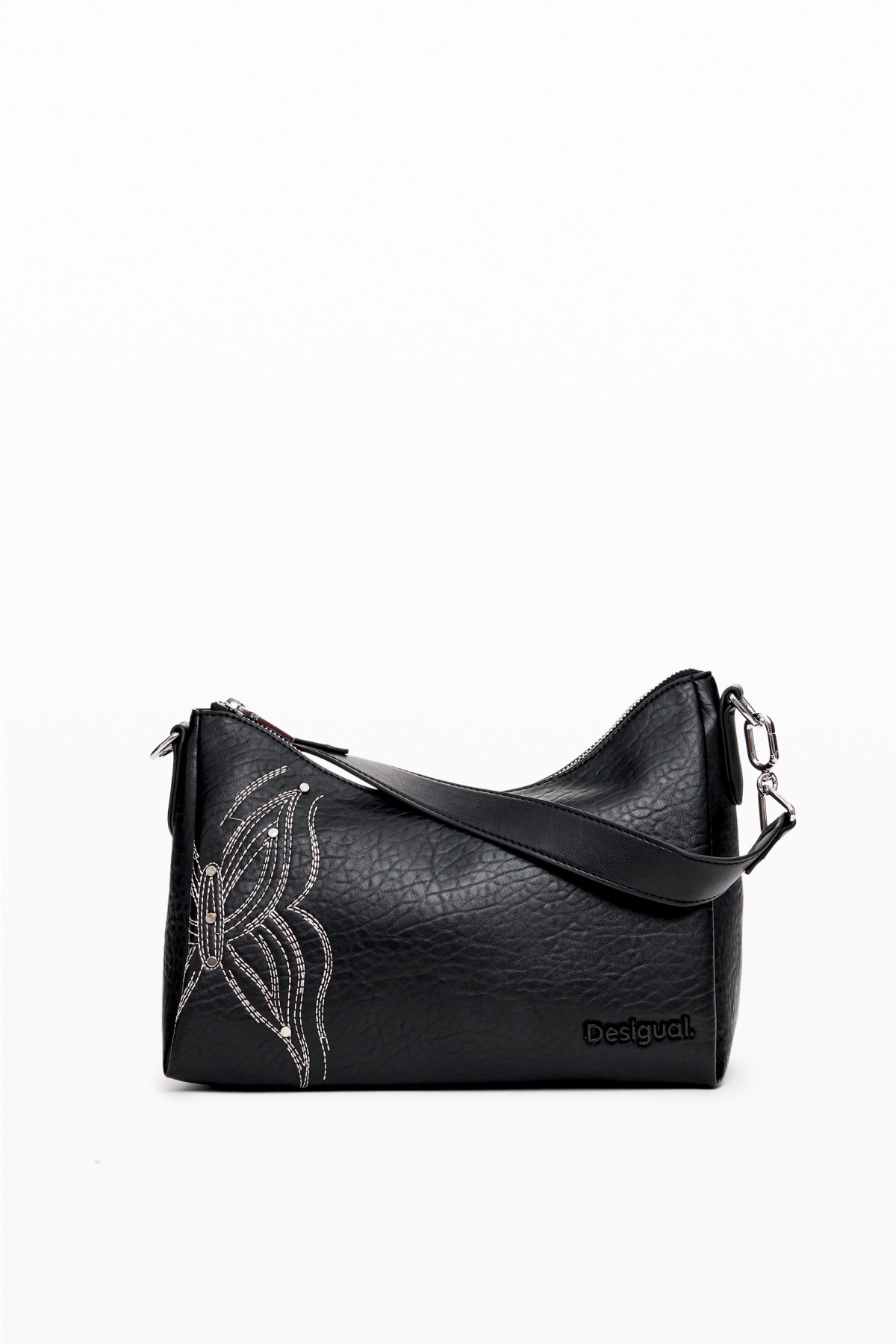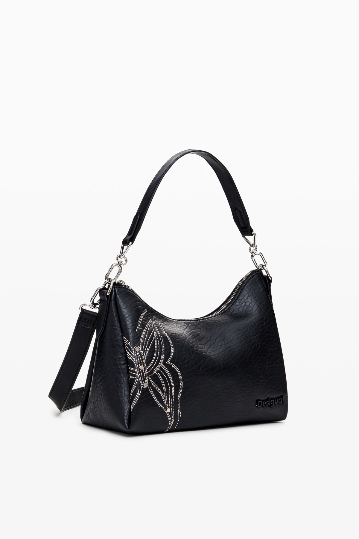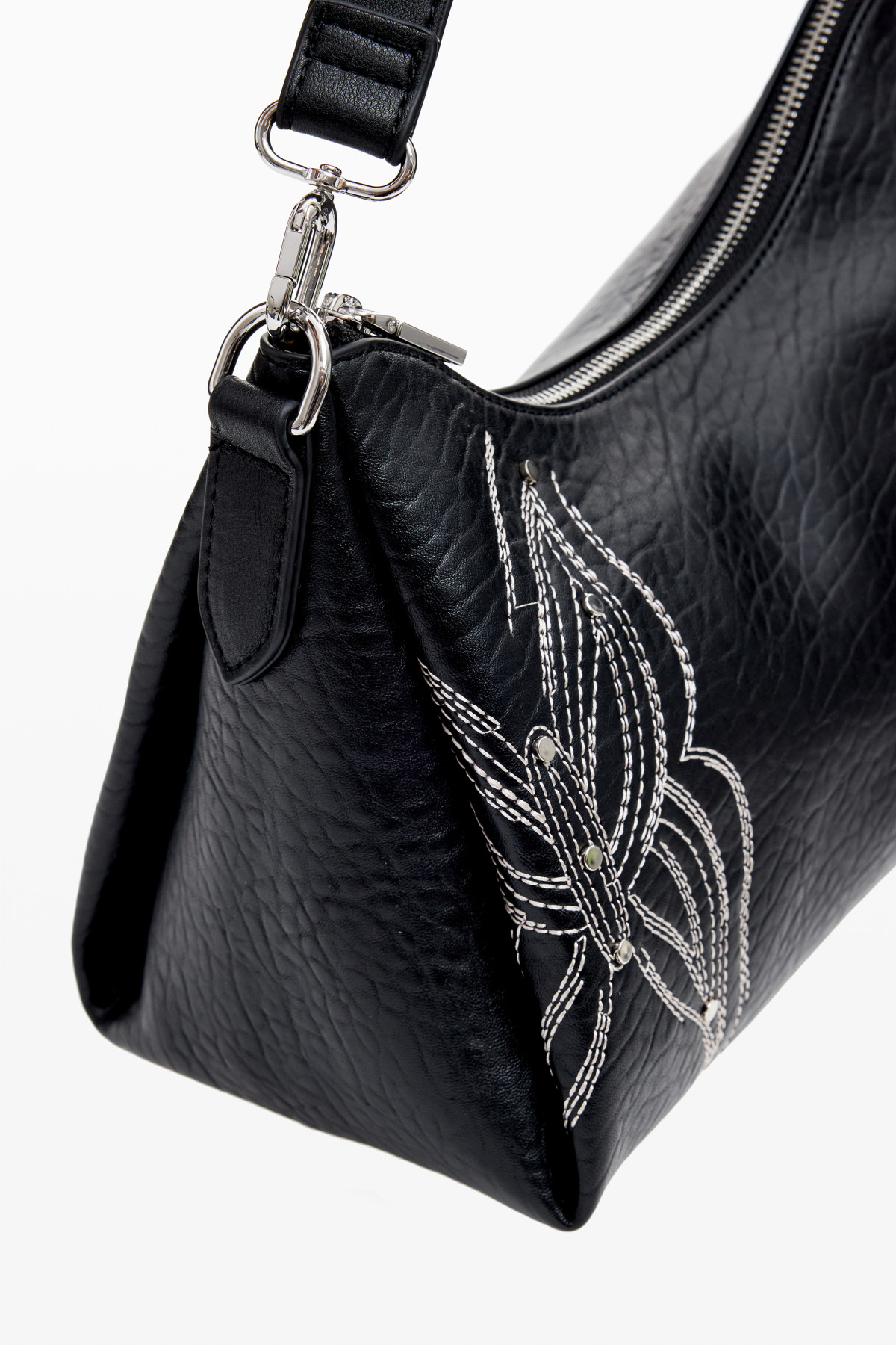 Két levehető műbőr fogantyú: egy rövid fogantyú szegecsekkel és egy hosszú állítható fogantyú, amellyel testen átvetve/ keresztben hordható a táska