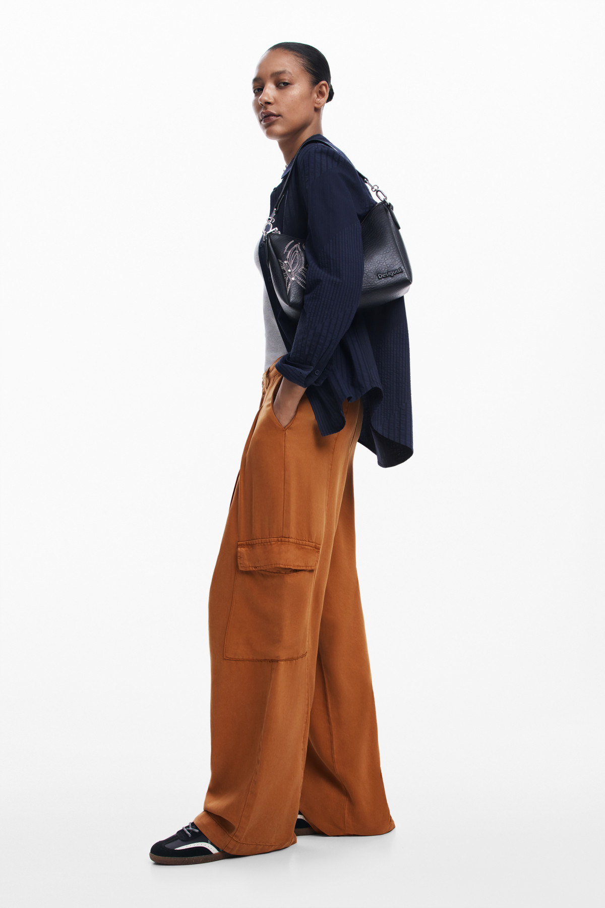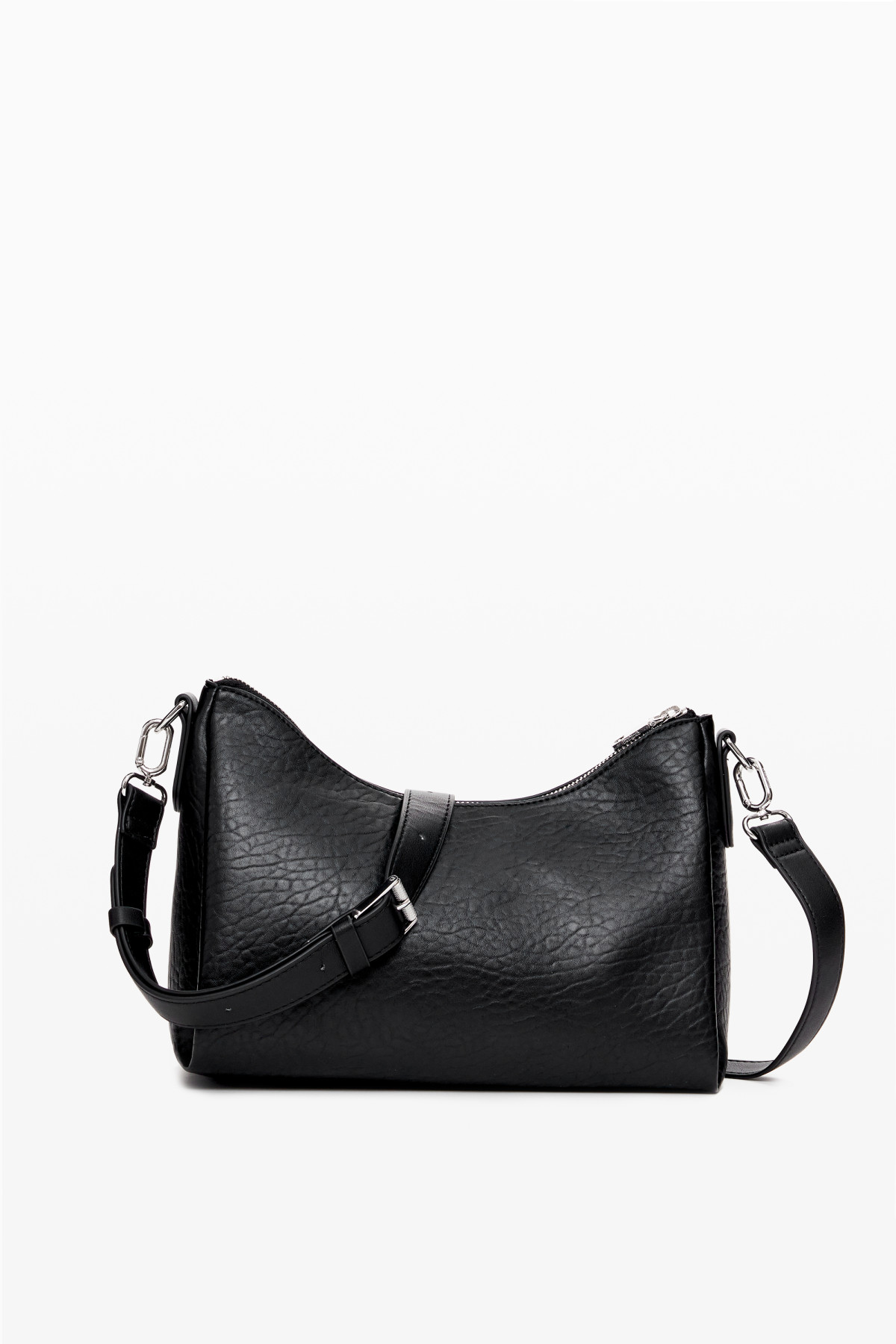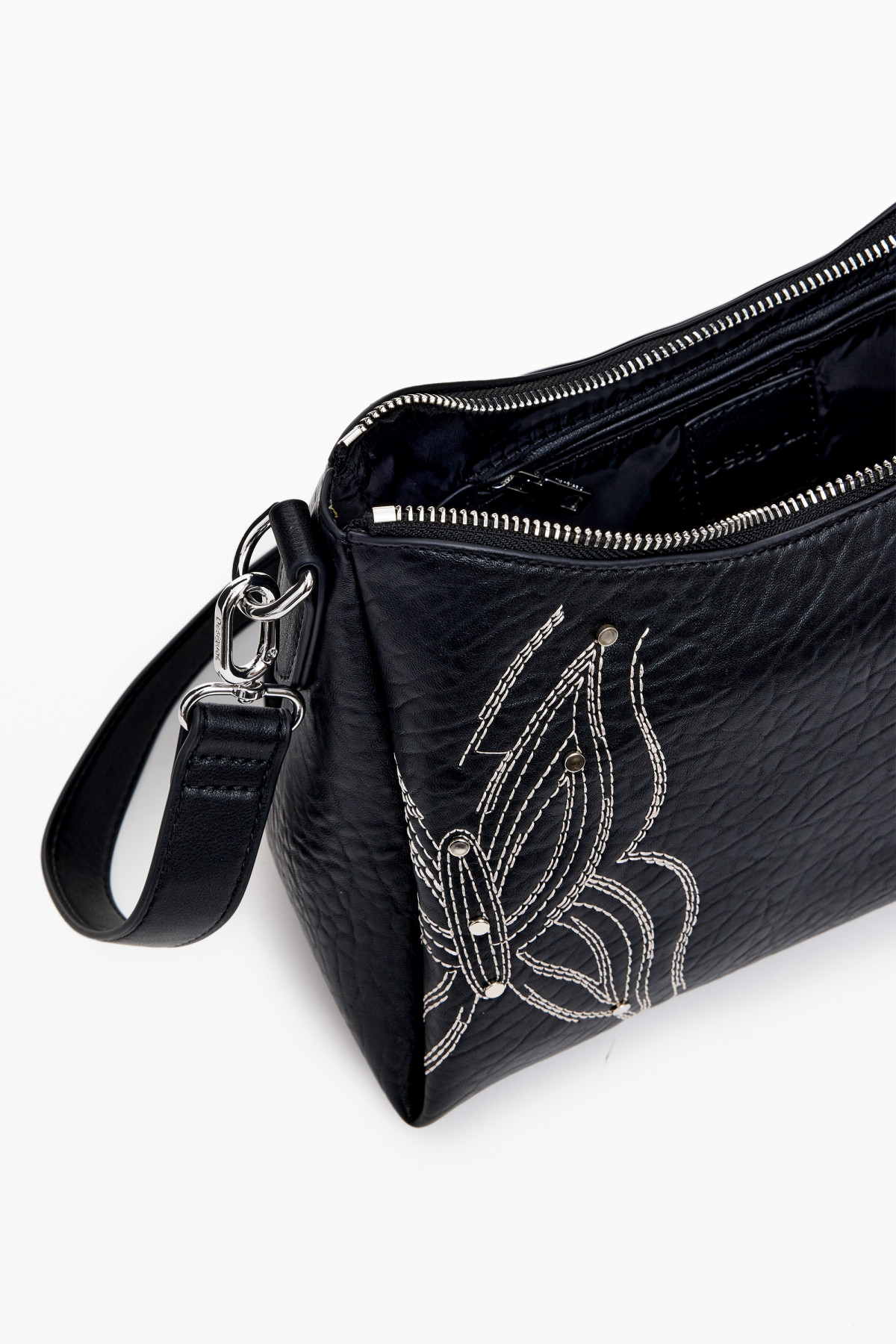 Két levehető műbőr fogantyú: egy rövid fogantyú szegecsekkel és egy hosszú állítható fogantyú, amellyel testen átvetve/ keresztben hordható a táska