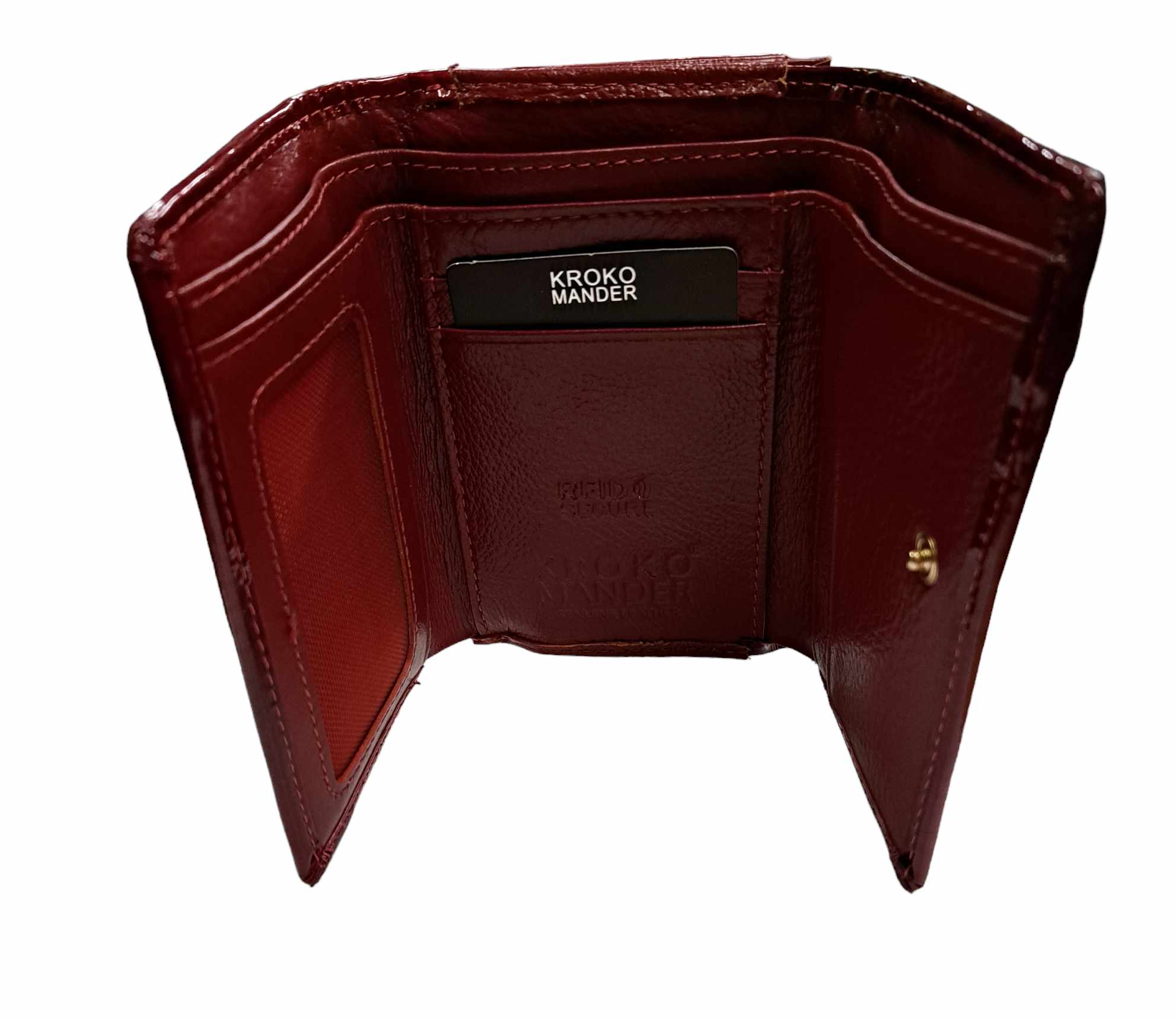 Piros színű, sok kártyatartós bőr pénztárca;